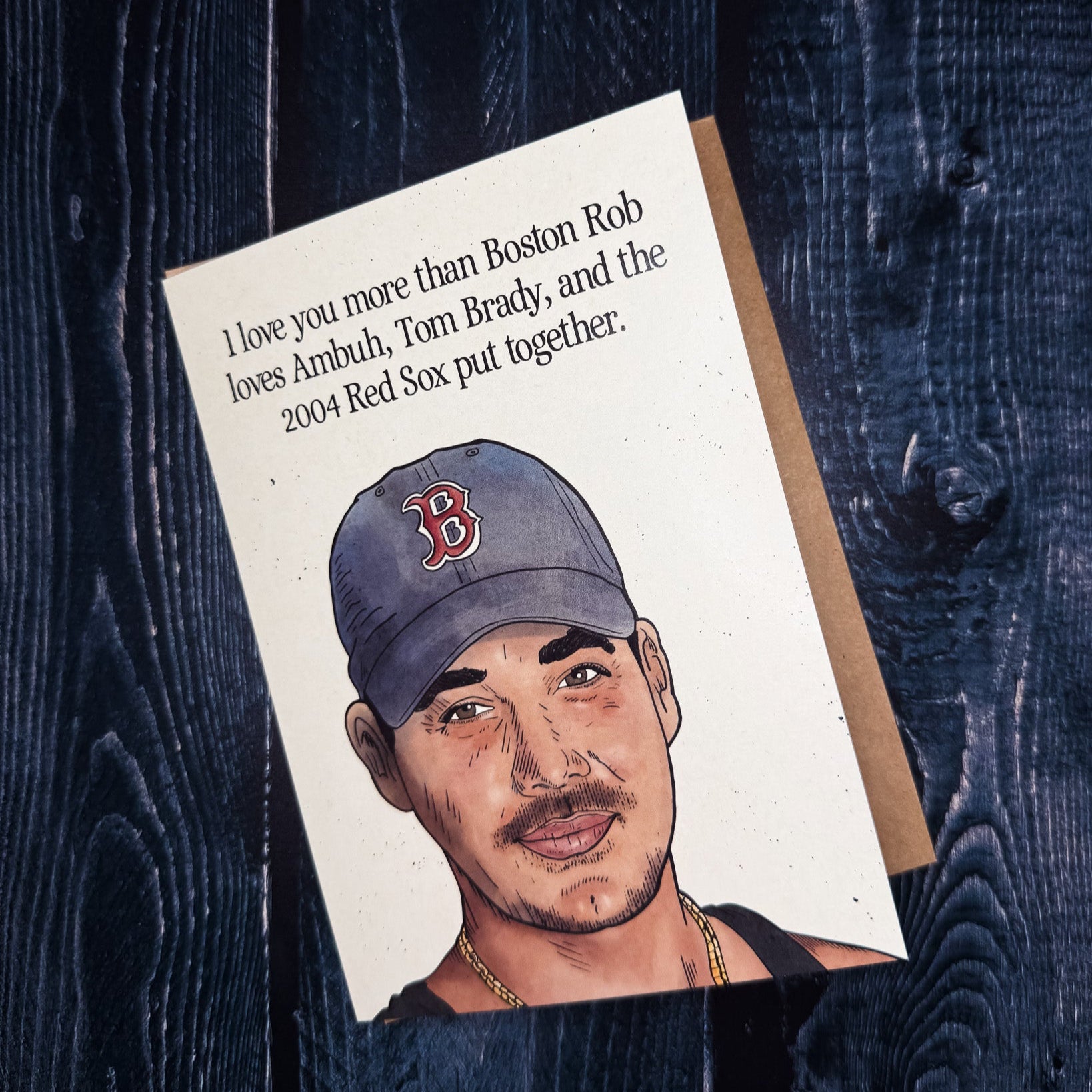 This handmade card featuring Boston Rob is perfect for the ageless Am-buh in your life, whether you’re both game-show-winning millionaires or not.